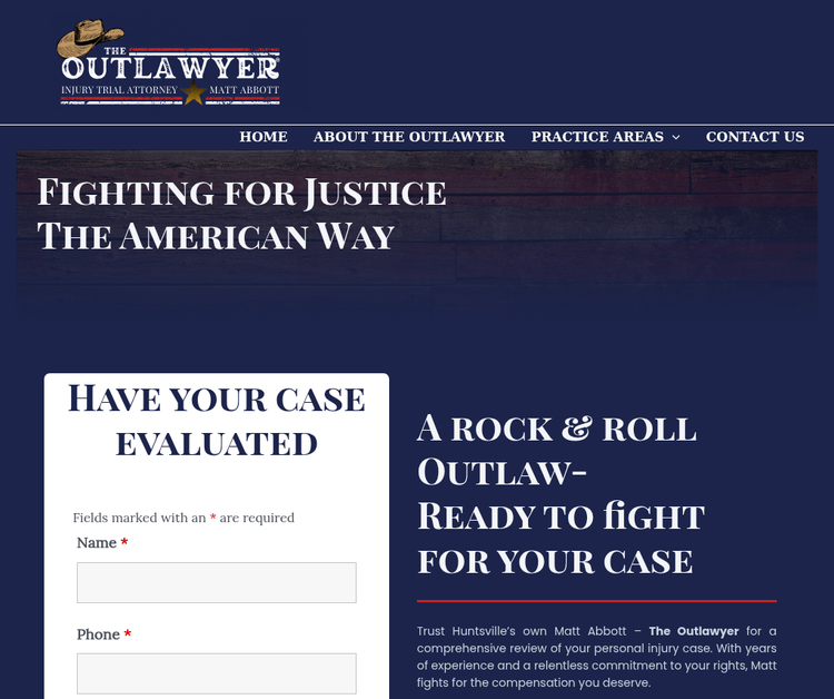Matt Abbott – The Outlawyer – is a skilled Personal Injury Attorney proudly serving the greater Huntsville area. With a deep understanding of the physical, emotional, and financial challenges that follow an accident, Matt is committed to fighting for the justice and compensation his clients deserve. He represents individuals in a wide range of personal injury matters, including car accidents, slip and fall incidents, workplace injuries, and medical malpractice claims. Drawing on his extensive knowledge, Matt develops strategic, personalized legal approaches for every case. He meticulously investigates each claim, negotiates assertively with insurance companies, and is always prepared to take a case to trial to secure the best possible outcome. Phone: 256-513-4309 Hours: Open 7am to 7pm