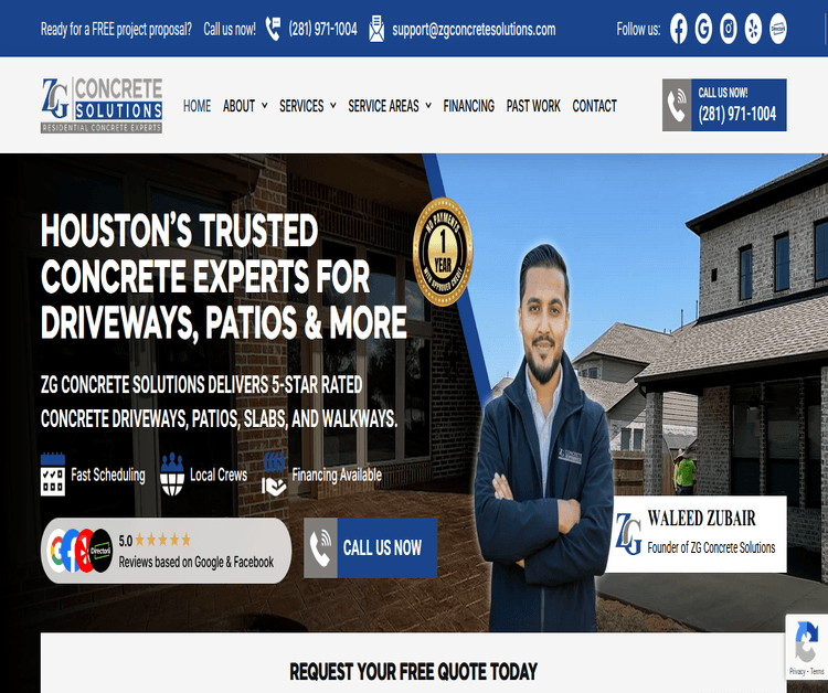 ZG Concrete Solutions is a trusted residential concrete contractor serving Houston homeowners with high-quality driveways, patios, walkways, sidewalks, specialty slabs, and decorative concrete solutions. With over 30 years of combined team experience, our company is known for professional project management, clear communication, honest pricing, and craftsmanship built to last. We focus on enhancing curb appeal, improving outdoor living spaces, and delivering durable concrete work designed for Houston’s climate. From driveway replacements to stamped concrete patios and custom installations, ZG Concrete Solutions is committed to reliable service, fast scheduling, and a 5-star customer experience from start to finish.