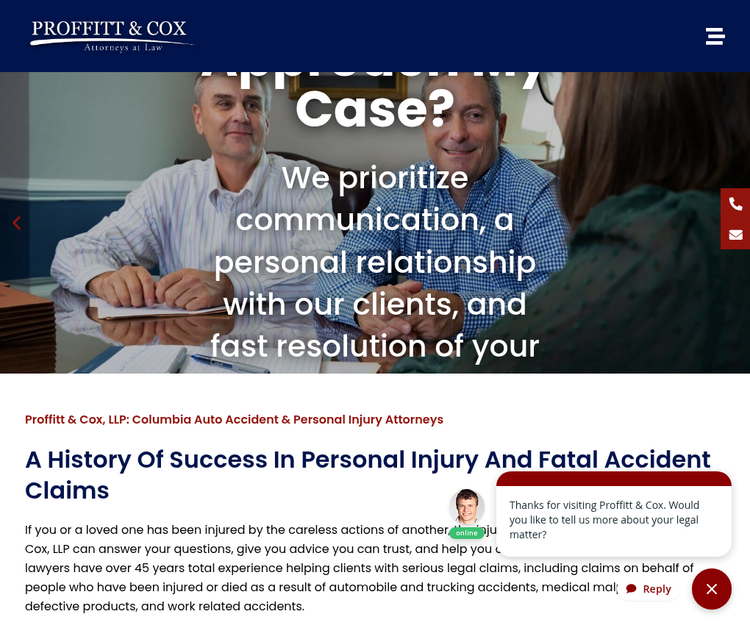 Proffitt & Cox, LLP has been a trusted name in personal injury law for over 45 years. Our seasoned attorneys specialize in a wide range of accident and negligence cases, providing aggressive representation for clients throughout South Carolina. We focus on building strong, personal relationships with each client, ensuring open communication from the first consultation through settlement or trial. Our firm's success is built on a proven track record of securing substantial compensation for injuries caused by automobile accidents, trucking incidents, medical malpractice, product defects, workplace accidents, slip-and-fall situations, and class-action claims. We offer free initial consultations and work on a contingency-fee basis, meaning you pay nothing unless we recover damages for you. This approach removes financial barriers and empowers injured parties to seek justice. Our dedicated team utilizes extensive investigative resources, expert witnesses, and strategic negotiation skills to protect your rights and maximize recovery. Whether you are a single victim or part of a larger class, we handle every case with meticulous attention to detail and compassionate support. Proffitt & Cox, LLP is committed to achieving the best possible outcome for every client, honoring our reputation as one of the region's most reliable personal injury law firms.