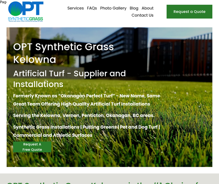 OPT Synthetic Grass Kelowna, Vernon, Penticton, Okanagan BC. Our North American-made synthetic grass ensures your space looks great and lasts for years, no matter the weather conditions. Save water, save money, and enjoy your weekends. Whether you want the best synthetic grass lawn, a backyard putting green, no more muddy paws, or a safe area for pets and kids, we''ve got you covered. Contact OPT Synthetic Grass Kelowna for artificial grass supply and installation. Free estimates available.