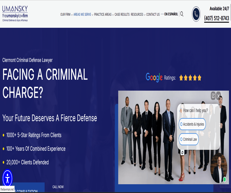 Dedication to our client’s rights and the determination to take on larger adversaries are what we stand for at The Umansky Law Firm Criminal Defense & Injury Attorneys. We are proud to serve the Clermont and Central Florida area and take on cases from DUI, drug, and gun charges to car accidents, slip & falls, and personal injuries. With hundreds of cases both inside and outside of Florida courtrooms, our attorneys offer the work ethic that garners results. We have the resources to take on complex personal injury and criminal defense cases. Call us today at (352) 558-2052 to get the representation you need.