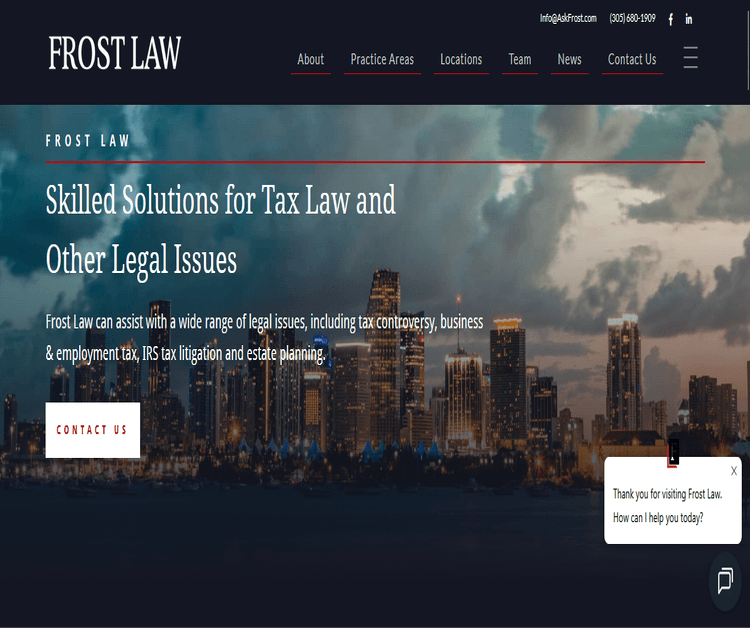 The tax attorneys, tax professionals, and CPAs at Frost Law are here to help you through the tax issues you may be facing. Whether you are dealing with Florida state tax issues, IRS tax issues, tax controversies, or more, our team will help provide you with answers and work with you to develop a plan to move forward. If you are in need of legal services in West Palm Beach or throughout Florida, contact Frost Law today. Phone: (561) 956-4126 Hours: Open 24 hours