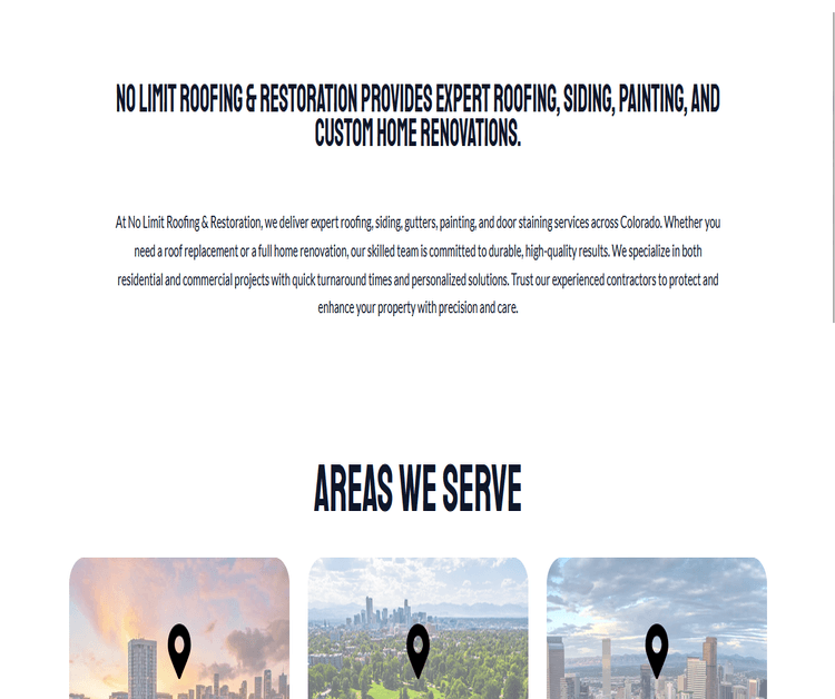 No Limit Roofing & Restoration proudly service Denver, Lakewood, and Aurora with expert residential and commercial roofing, exterior remodeling, and home maintenance services. From homes to business properties, our experienced team delivers top-quality solutions including roofing, siding, windows, gutters, painting, and door staining. Whether you're a homeowner looking to enhance curb appeal or a business needing reliable exterior upgrades, we offer custom, cost-effective services tailored to your needs. Get in touch today for a personalized estimate and experience service with no limits. Services: Roofing Contractor Denver, CO Siding Contractor Denver, CO Windows Gutters Denver, CO Painting Denver, CO Staining doors Denver, CO Roofing and Restoration Denver, CO Service Areas: Denver, CO Lakewood, CO Aurora, CO