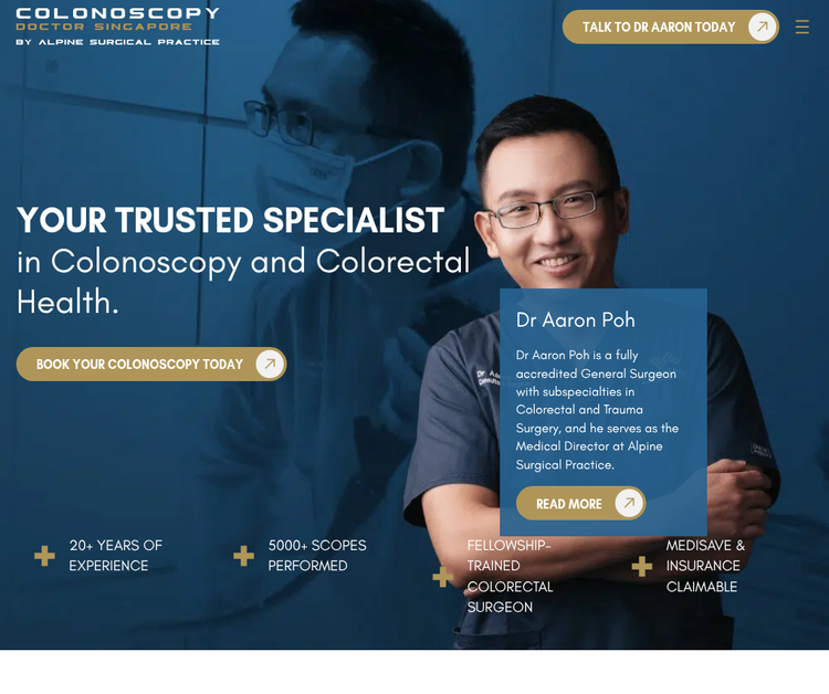 Colonoscopy Specialist Singapore – Dr Aaron Poh As a consultant colorectal surgeon, Dr Aaron Poh offers comprehensive colonoscopy services at Alpine Surgical Practice, Mount Elizabeth Hospital. He has more than 20 years of surgical training, is fellowship-trained in colorectal surgery, and has performed over 5000 scopes. Colonoscopy screening is a proven method for detecting polyps and preventing colorectal cancer, Singapore’s most common cancer. Dr Poh also performs advanced procedures such as Endoscopic Mucosal Resection and minimally invasive colorectal surgery. His practice accepts Medisave and insurance claims. Address: 3 Mount Elizabeth, #14-06a, Singapore 228510; Phone: 8875 0080