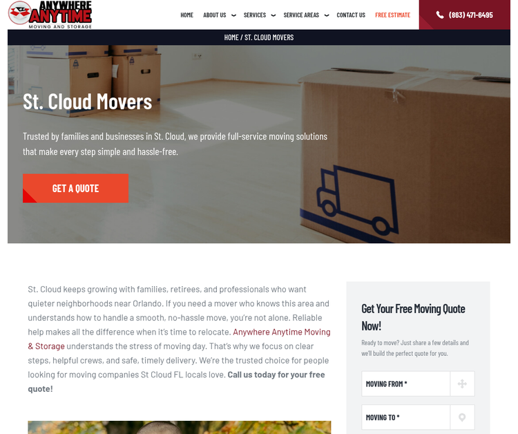 At Anywhere Anytime Moving and Storage, we’ve built our reputation on trust, speed, and care. We offer every service you need to relocate with confidence—from disassembly and packing to full transport and storage options. As one of the most efficient moving services in St. Cloud, we come equipped with experience and the tools to handle everything from start to finish, even complex moves. We’re proud to be among the Florida movers people call first when they want a hassle-free experience with real professionals at every step. Our commitment to local families and businesses means we treat every move as if it were our own, with attention to detail and respect for your time. Phone 407-908-7978
