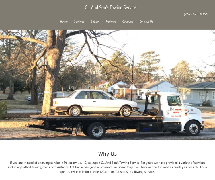 C.J. And Son's Towing Service is more than a business; it’s a trusted partner for families, businesses, and travelers throughout the region. Our dedication to quality, reliability, and customer satisfaction has earned us glowing reviews and a loyal customer base. When you’re in need, call our number and experience the peace of mind that comes from knowing you’re in the hands of professionals who care. We stand behind every service with a satisfaction guarantee, ensuring you never pay more than necessary. Phone: +1 252-670-4965