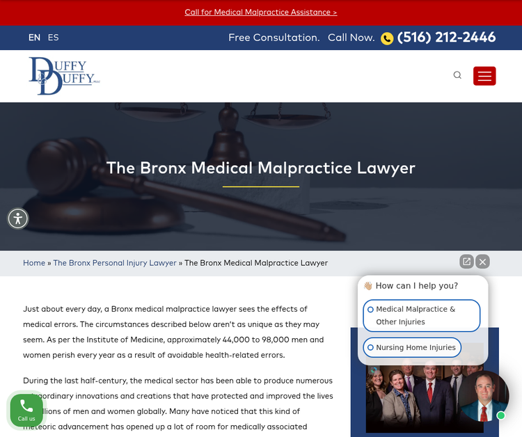 The attorneys and staff at Duffy & Duffy, PLLC provide strong legal representation and counsel to those who have been injured due to medical malpractice, nursing home abuse, and other forms of negligence. We hold medical professionals and insurance companies accountable for the tragic outcomes their negligence can cause, from avoidable surgical errors on the doctor's part to dictating ineffective courses of treatment on the insurance company's part. Our personalized approach helps us understand each client's unique situation and provide the most effective counsel possible to those in the Bronx and throughout New York. If you have been injured due to another's negligence, contact Duffy & Duffy today. Business Hours:- 24/7