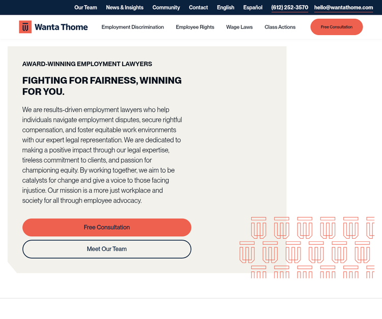 At Wanta Thome PLC, we are results-driven employment lawyers committed to helping individuals navigate employment disputes—including cases of workplace harassment and wrongful termination—secure rightful compensation, and foster equitable work environments through expert legal representation. Our Minneapolis firm is dedicated to making a meaningful impact through our legal guidance, unwavering client advocacy, and passion for championing equity. By working together, we strive to be catalysts for change and give a voice to those facing injustice. Our mission is clear: to advance a more just workplace and society for all through strong employee advocacy.