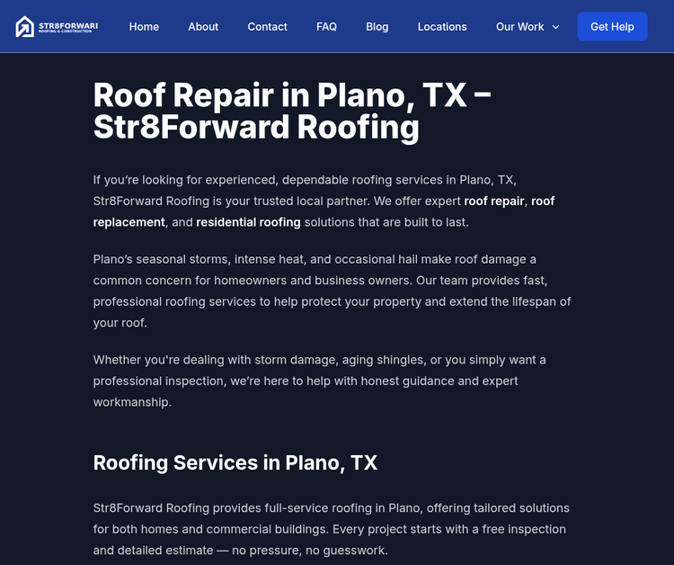 Str8Forward Roofing proudly serves Plano, TX, and the greater North Texas area from our location at 3920 Alma Dr, Plano, TX 75023. We are a locally owned and operated roofing company dedicated to providing honest, reliable, and high-quality roofing solutions that stand the test of time. Whether you’re dealing with storm damage, leaks, or an aging roof, our experienced team is here to protect your home or business with durable materials, skilled craftsmanship, and exceptional service. Our roofing professionals specialize in roof repair, full roof replacement, hail damage repair, storm restoration, and insurance claim assistance. We understand the unique weather challenges faced by North Texas homeowners and provide tailored solutions designed to withstand intense sun, hail, and wind. From small residential repairs to large-scale commercial roofing projects, we handle every job with precision, transparency, and care. At Str8Forward Roofing, integrity is at the heart of everything we do. We believe in straightforward communication, fair pricing, and delivering results that exceed expectations. Our mission is to ensure every customer feels confident and protected under a strong, reliable roof. Address: 3920 Alma Dr, Plano, TX 75023 Phone: (469) 328-1753 Website: https://www.str8forwardroofing.com/locations/roof-repair-plano-tx