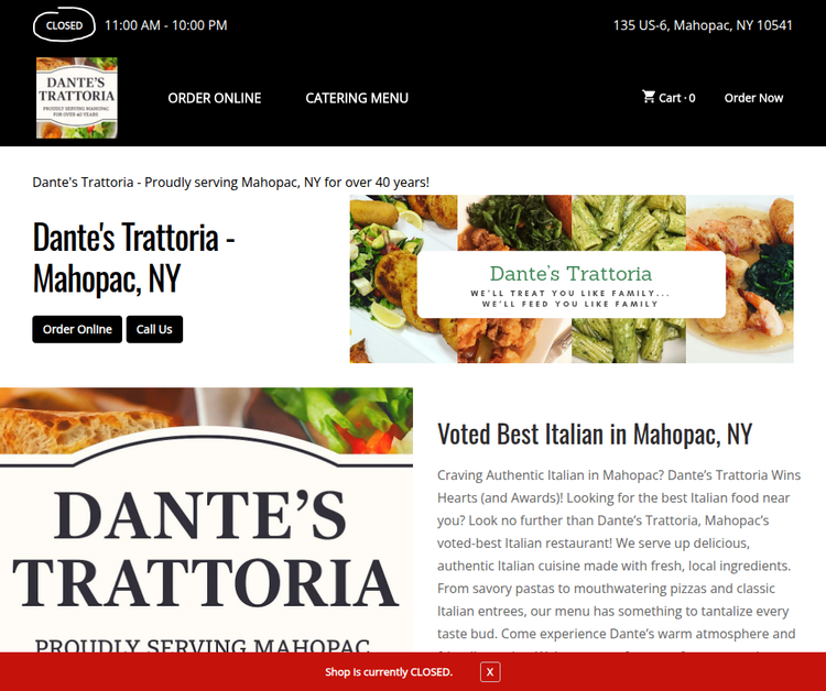 Whether you’re dining in, ordering take‑out, or enjoying our convenient delivery, we bring the same passion and quality to every plate. With a commitment to culinary excellence, generous portions, and friendly service, Dante’s Trattoria remains Mahopac’s premier choice for authentic Italian cuisine. Visit us today and taste the tradition that has kept our guests coming back for generations.