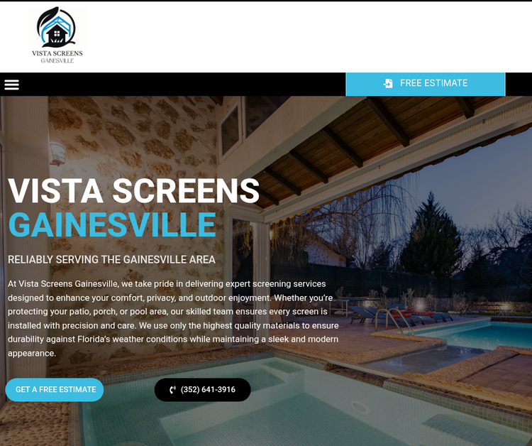 Vista Screens Gainesville is your trusted expert for screen installation, repair, and replacement in Gainesville, FL. We specialize in patio screening, pool enclosures, lanais, and commercial screening, delivering durable, high-quality results built to last. Fast service, free estimates, and unmatched attention to detail.