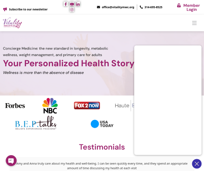 https://vitalitymwc.org/ : Founded in 2021, Vitality Medical and Wellness Consulting is a premier concierge clinic based in Saint Louis, Missouri, USA. Catering to adults across Missouri and southern Illinois, we offer comprehensive, sustainable, science-based weight loss solutions. We excel in supporting our clients in reversing lifestyle and behavior-related chronic diseases. Our mission is to support individuals in transforming their lives through personalized strategies. We combine medical excellence with a holistic approach to health, ensuring that each client receives the guidance and support needed to achieve their weight loss and wellness goals. We are dedicated to empowering our clients with the knowledge and tools necessary for a healthier lifestyle, leading to improved physical and mental health outcomes. Visit vitalitymwc.org to discover how we can help you embrace a vibrant, healthier future.3009 N Ballas Road, Building B, Ste 215, Saint Louis, Missouri 63131
