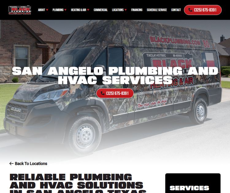 At Black Plumbing, we put our customers first in all we do, and we''re proud to serve homeowners and businesses in the San Angelo area. With 25 years of experience in the industry, we take pride in the long-term relationships we''ve built with our customers. Our experienced team of fully-licensed plumbers can take care of any plumbing job, from leak repairs and installations to annual maintenance service and more.