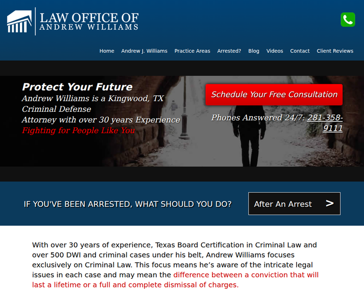 With over 20 years of experience, Texas Board Certification in Criminal Law and over 500 DWI and criminal cases under his belt, Andrew Williams focuses exclusively on Criminal Law. This focus means he’s aware of the intricate legal issues in each case and may mean the difference between a conviction that will last a lifetime or a full and complete dismissal of charges.