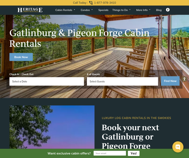 Heritage Cabin Rentals in Pigeon Forge offer everything from one to nine bedroom cabins. Our fully-furnished rental cabins are located in both Pigeon Forge and Gatlinburg. Whether you wish to be near the heart of town, near a mountain stream, or enjoying a mountain view our cabins in Pigeon Forge and Gatlinburg will suit your needs. Amenities include game rooms, hot tubs, swimming pool access, fireplaces and Wi-Fi. Find your cabin in the Smoky Mountains at Heritage Cabin Rentals.