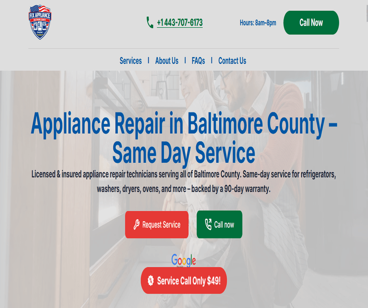 "Fix Appliance Baltimore County" delivers trusted, affordable, and same-day appliance repair throughout Baltimore County and nearby communities. Our certified technicians handle refrigerators, freezers, ovens, stoves, dishwashers, washers, and dryers — repairing all major brands like Whirlpool, Samsung, LG, GE, Maytag, and Frigidaire. Whether you searched for “appliance repair near me” or heard about us from a friend, you’ll get clear pricing, no hidden fees, and service backed by a 90-day warranty. We’re proud to provide local homeowners and businesses with quick solutions that extend the life of their appliances and prevent costly replacements. For fast appliance repair you can rely on, call us today.