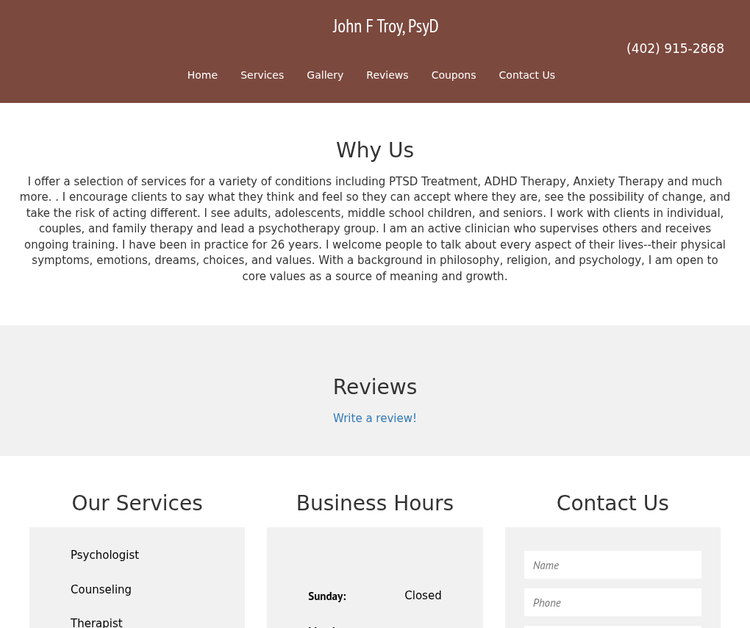 With 26 years of dedicated practice, Dr. John F. Troy offers a comprehensive range of therapeutic services that cater to individuals, couples, families, and groups. Rooted in a foundation of philosophy, religion, and psychology, his approach emphasizes the integration of core values as a source of meaning and growth. Clients are encouraged to openly discuss their thoughts, feelings, physical symptoms, dreams, choices, and values, fostering a collaborative environment where insight and change are co‑created.