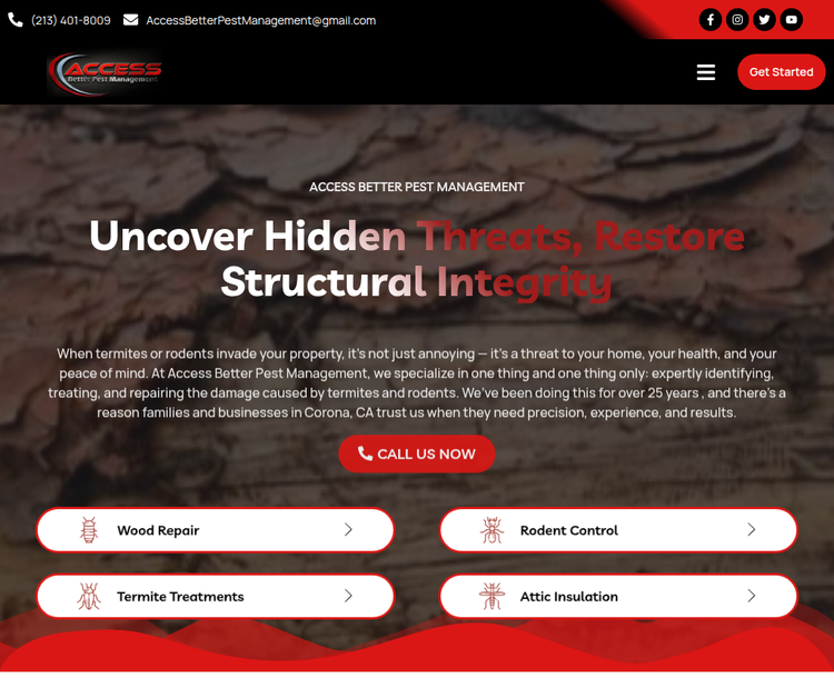 Access Better Pest Management is a trusted local pest control company proudly serving Lake Elsinore, Corona, and Long Beach, Los Angeles, Newport Beach and surrounding areas. We specialize in professional pest control, termite control, rodent control, and exterminator services. We serve residential, commercial, and municipal clients. Whether you're searching for an exterminator, pest control, rodent control, termite control near me, same-day pest control, or detailed pest inspections, our experienced team delivers customized solutions. With 25+ years of experience, we deliver expert rat, mouse, termite, bed bug, and ant control with a focus on lasting prevention. Contact us today for fast, dependable pest control services you can trust. Visit us at Corona, CA, 92882 and Call us at (213) 401-8009.