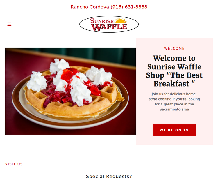 The Sunrise Waffle Shop has earned local recognition, featuring on Sacramento’s favorite food shows and earning rave reviews on Yelp for our consistency and welcoming vibe. We are proud to be the go‑to breakfast spot for events, parties, and corporate gatherings, thanks to our flexible catering services that bring the Sunrise experience to your doorstep.