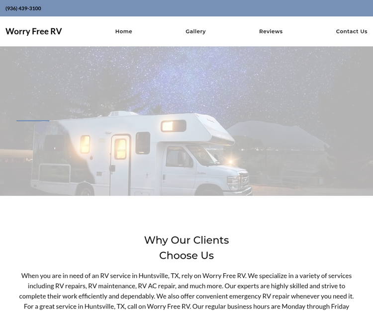 Worry Free RV is the premier destination for all your recreational vehicle needs in Huntsville, TX. Our team of certified technicians is dedicated to delivering high‑quality repairs, maintenance, and parts for every type of RV, from travel trailers to motorhomes. We pride ourselves on fast, dependable service that keeps you on the road and enjoying the open‑air lifestyle you love. Our business hours run Monday through Friday, 8:00 AM to 6:00 PM, with weekend emergency coverage to ensure you’re never stranded. Located just off Highway 75 N, our convenient address makes it easy to bring your vehicle in for a thorough inspection or quick fix. Whether you need routine maintenance or a complex repair, we work with precision and care to exceed your expectations. At Worry Free RV, we understand that every minute on the road counts. That’s why we offer a full range of services—including RV AC repair, part replacement, and mobile repair visits—to keep your vehicle performing at peak level. Our parts inventory is stocked with OEM and aftermarket options, ensuring reliable performance and longevity. We also provide on‑site service for those who can’t bring their RV to our shop. We’re committed to transparency, affordability, and customer satisfaction. Our friendly staff will walk you through every step, from diagnosis to final walk‑through, ensuring you understand the work performed and the cost involved. With a reputation built on honesty and expertise, Worry Free RV is the trusted choice for Huntsville residents who value reliability and peace of mind while traveling.
