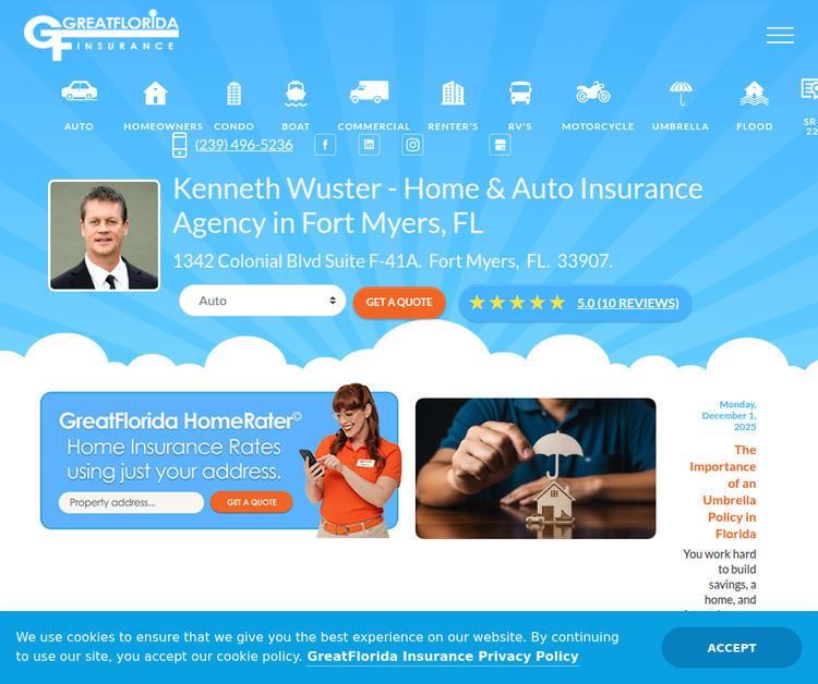 Serving Fort Myers and Southwest Florida since 1992, GreatFlorida of Central Fort Myers is a trusted insurance agency in Fort Myers, FL. We specialize in auto insurance, home insurance, commercial insurance, flood insurance, renters insurance, motorcycle insurance, and umbrella coverage. As an independent insurance broker in Lee County, we compare top-rated insurance carriers to secure competitive rates and personalized coverage. Whether you need car insurance or Florida homeowners insurance, our experienced agents deliver reliable service and affordable insurance quotes. Get your free quote today. Visit us at 1342 Colonial Blvd F41A, Fort Myers, FL 33907, United States and Call us at (239) 496 5236.